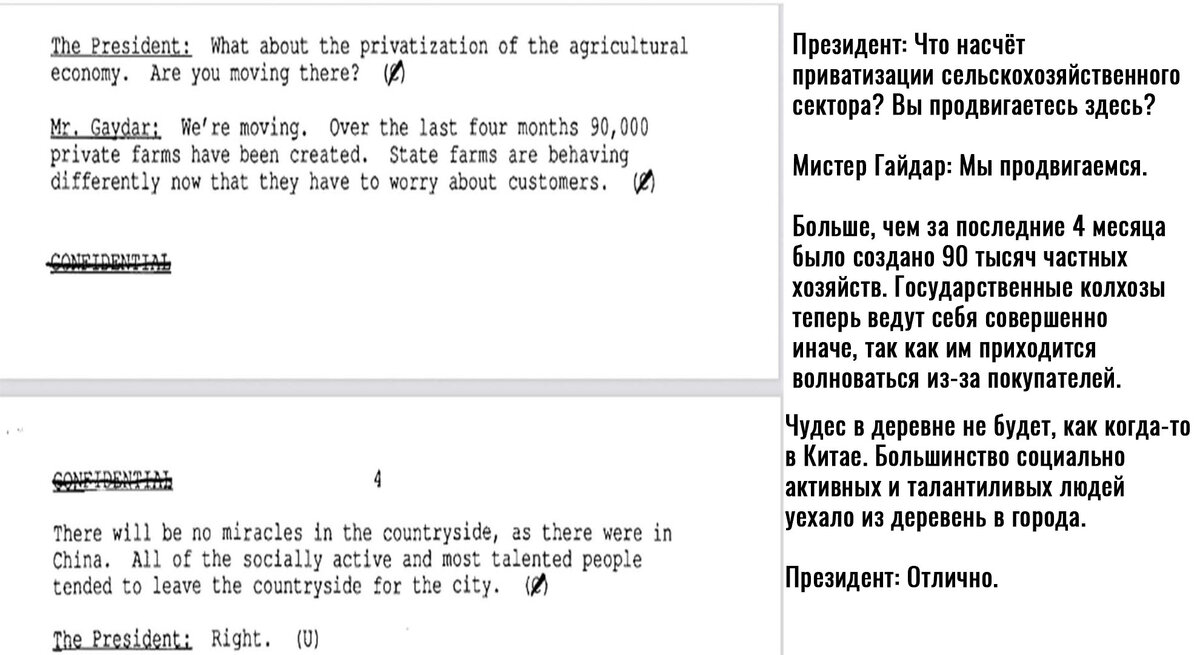 Таким образом, на двух наглядных примерах мы можем видеть прямые последствия сохранения и модернизации советского сельского хозяйства в Беларуси и разрушение его через радикальные рыночные реформы и приватизации в России. К слову, американцы уже давно опубликовали переговоры Буша-старшего с Егором Гайдаром, в которых Егор Тимурович отчитывается, что приватизация сельского хозяйства идет строго по графику.