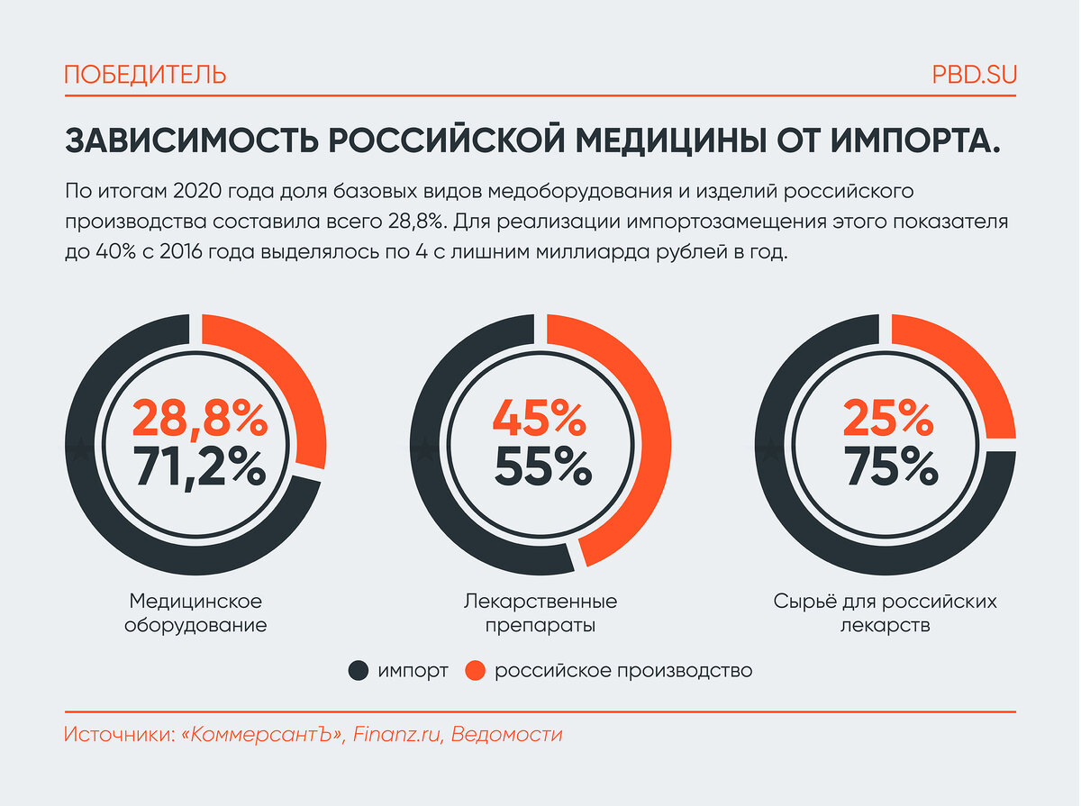 А кроме яиц схожая ситуация наблюдается в тяжелой промышленности, наукоёмких отраслях, фармацевтике и так далее. Например, доля импорта в медицинском оборудование превышает 70%, также и как доля сырья для лекарственных препаратов. Таких примеров можно приводить еще очень много.