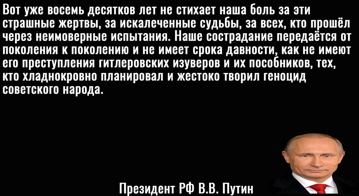 Помимо прочего, Путин произнес речь с которой, в целом, сложно не согласится. Особенно в той части, когда президент стал говорить о том, что преступления нацистов и их пособников не могут иметь срока давности. Здесь остается лишь согласиться с российским лидером и признать, что гражданский долг каждого россиянина – пресекать любые попытки реабилитации подобных персонажей.