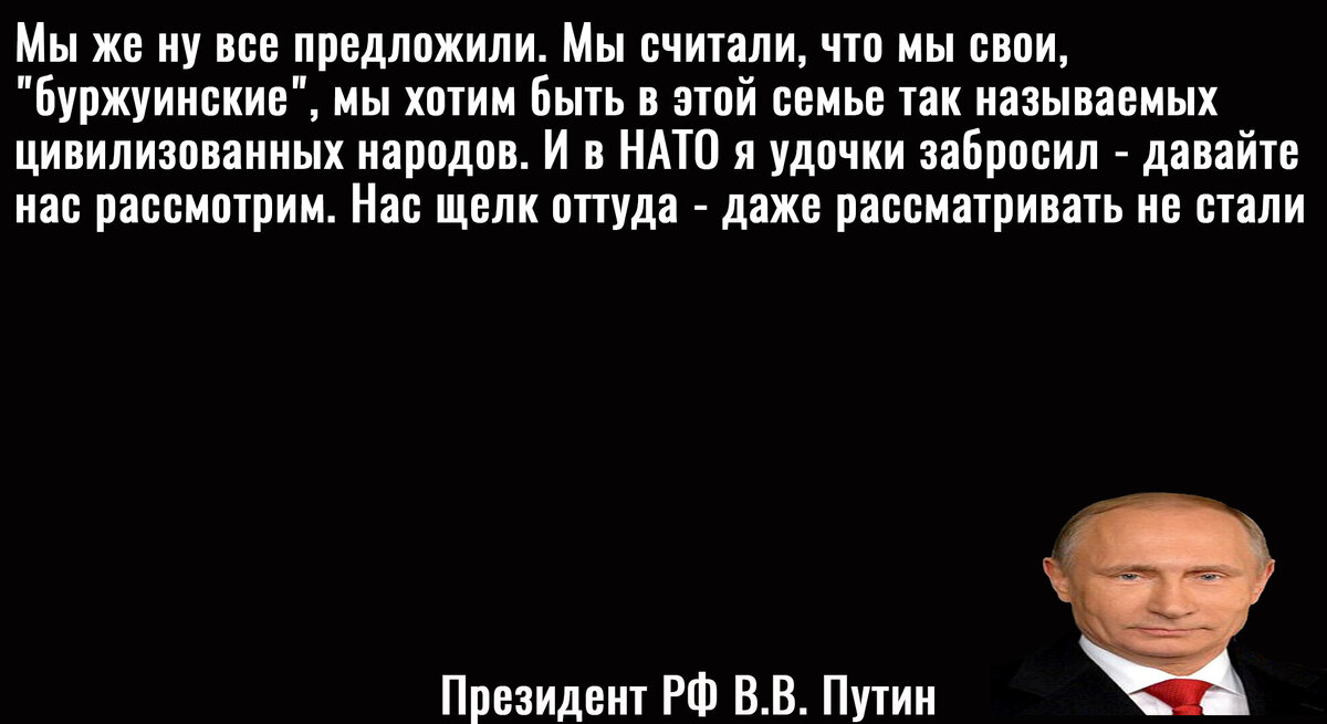 Такие слова "главного начальника" говорят нам о многом. Во-первых, как уже было сказано, видимо, в кремлевских кабинетах никто серьезно не воспринимает современной антизападной истерии федеральных СМИ, угрозы НАТО и так далее. Хотя, если посмотреть на карту расширения этого блока в последние десятилетия, то основания для опасений должны быть.