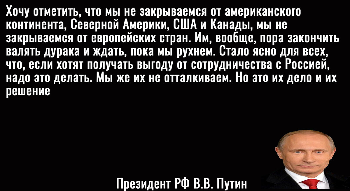 Как можно видеть выше, с точки зрения действующего президента, США и Европа просто "валяют дурака", то есть просто где-то заблуждаются, ведут не самую адекватную политику, но совсем не являются какими-то врагами для России. Согласитесь, что весьма сложно представить, чтобы Сталин в году так 1943-1944 предлагал лидерам Третьего Рейха и фашистской Италии "перестать валять дурака" с целью дальнейшего сотрудничества.