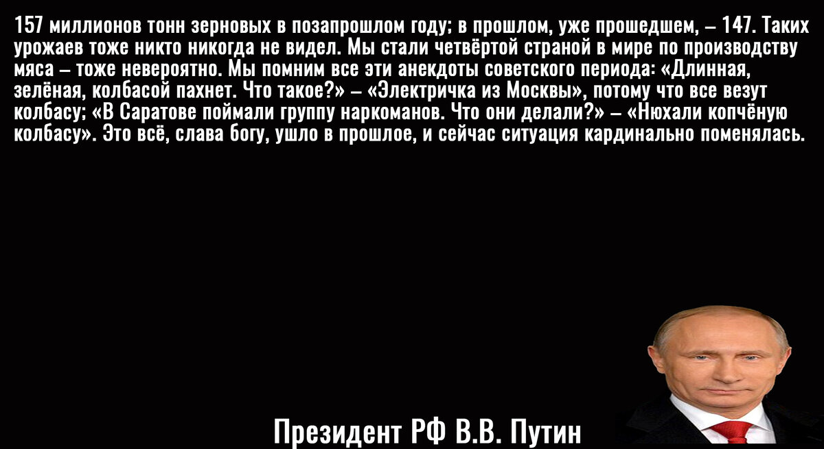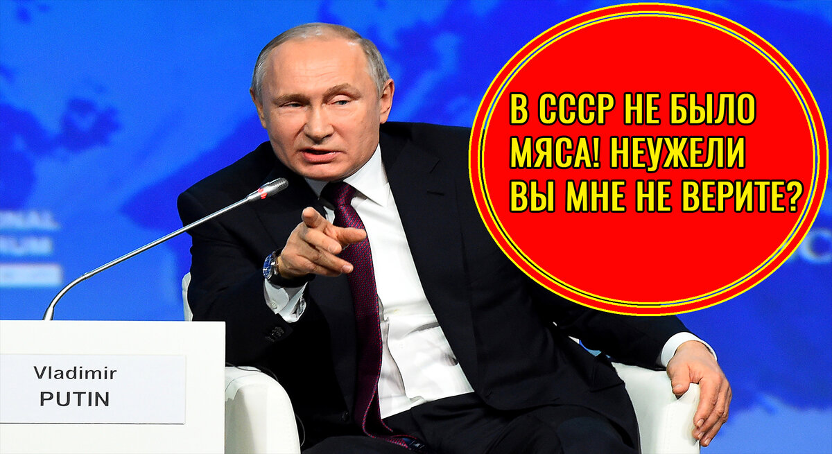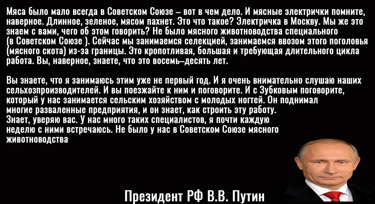 Казалось бы, что есть много чего обсудить из актуальной повестки, но "главный начальник" посреди рассказов о том, что Россия является одним из лидеров по производству мяса в мире, решил рассказать анекдоты о дефиците мяса в СССР, бравируя тем, что всё это уже в прошлом и никогда не повторится.