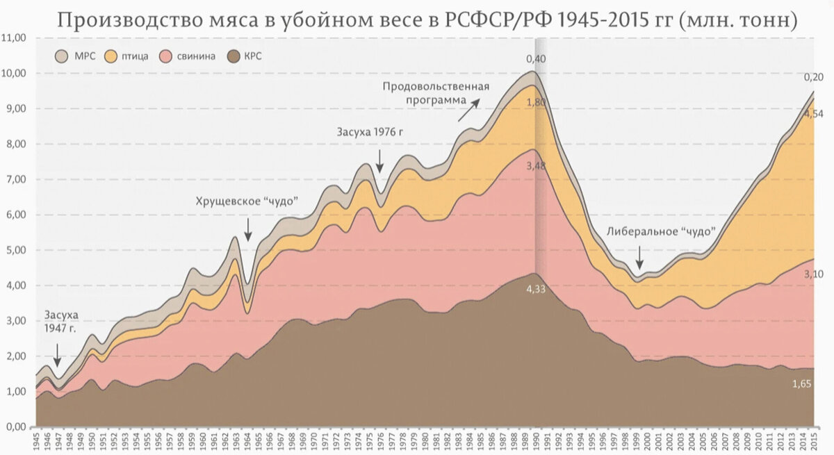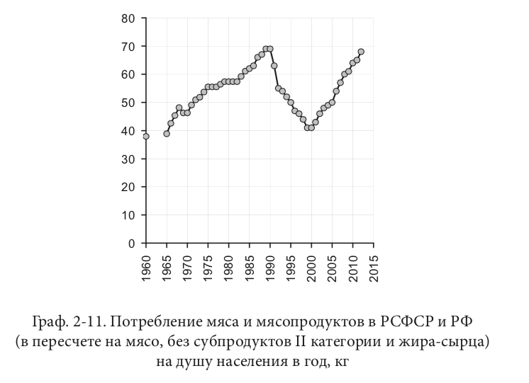 Итак, если мы рассмотрим график потребления мяса и мясных продуктов, то увидим, что он стал догонять поздние советские показатели лишь к более-менее благополучному 2015 году. Другими словами, отечественным "эффективным менеджерам" потребовалось 25 лет, чтобы хотя бы сравнятся с уровнем потребления мяса в СССР.