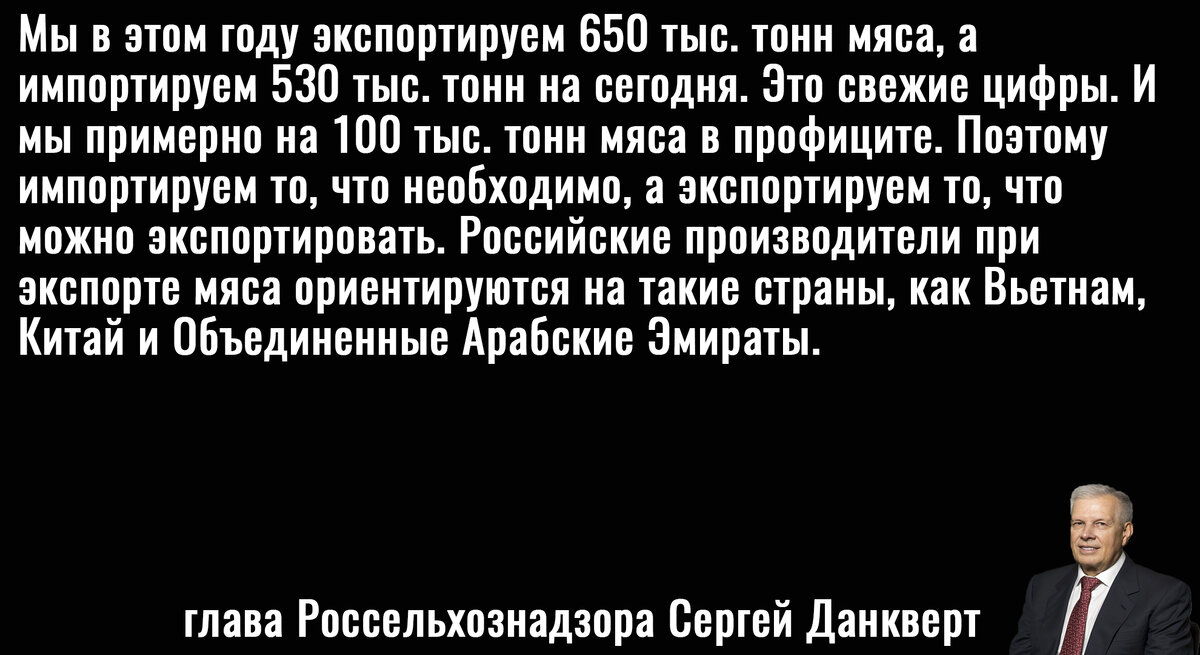 Более того, российские начальники с гордостью рассказывают о том, что Россия больше экспортирует, чем импортирует мяса. Например, в конце 2022 года глава Россельхознадзора Сергей Данкверт заявлял, что мясной экспорт превысил импорт на сто тысяч тонн.