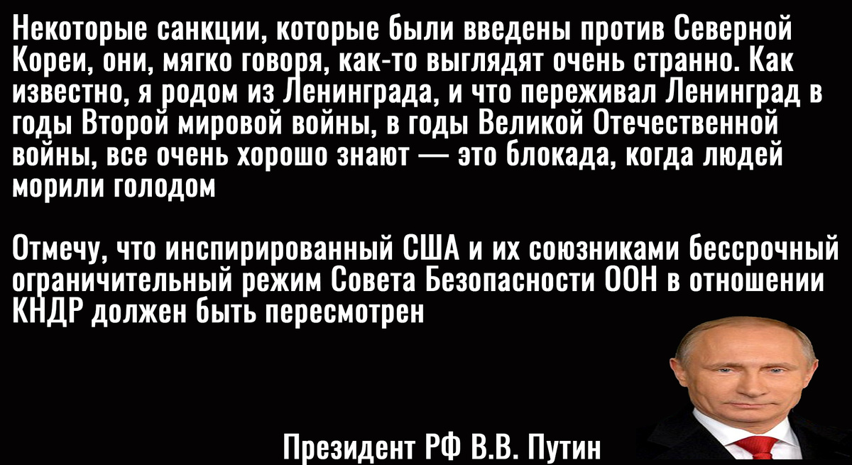 Ещё один такой пример очень быстро "переобувания", то есть смены своей позиции, продемонстрировал действующий президент по отношению к КНДР. Во время недавнего визита в эту страну Путин заявил о том, что санкции против Северной Кореи являются несправедливыми и их можно сравнить с блокадой Ленинграда.