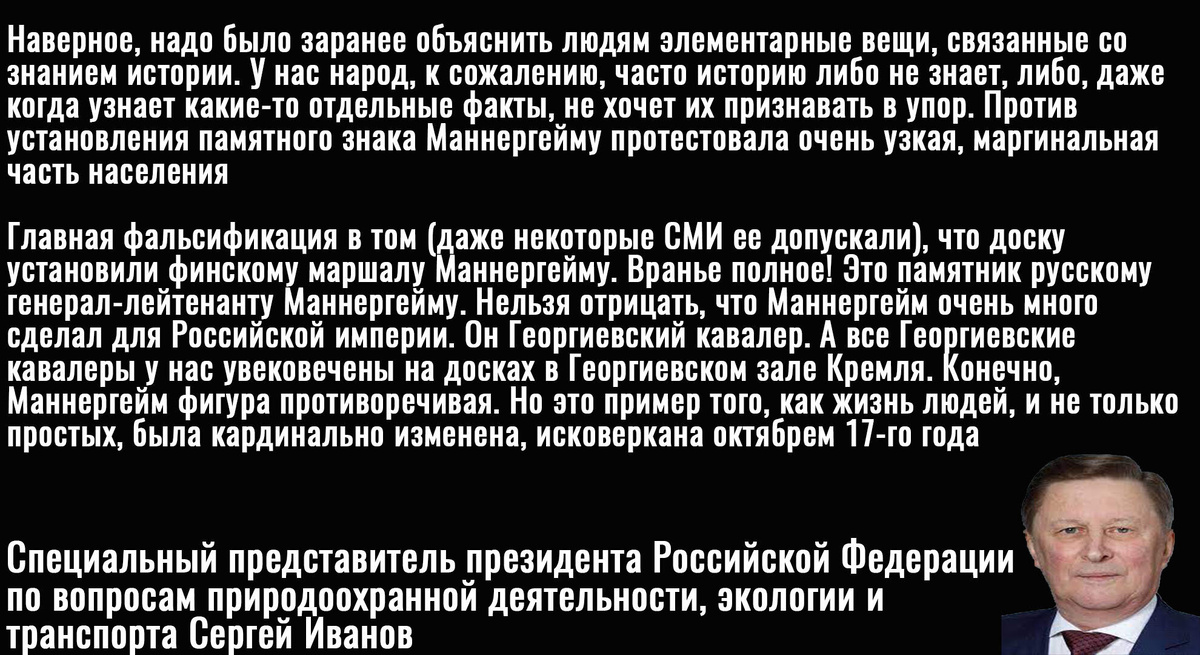 К слову, крайне показательно, что вместо того, чтобы извиниться за инцидент с доской Маннергейму в бывшем Ленинграде высшее начальство предпочло занять совсем иную позицию. Спецпредставитель Президента РФ Сергей Иванов говорил, что народ просто ничего не понимает в истории, а против доски протестуют одни маргиналы.