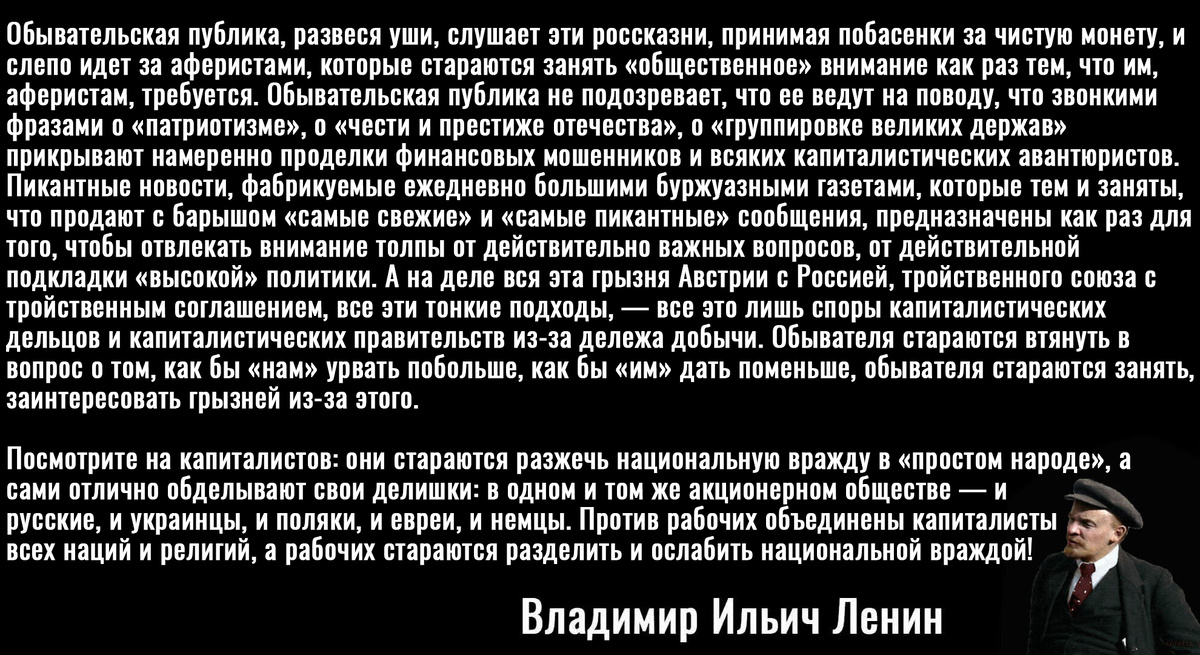 Если кто-то так ещё думает, то ему стоит почитать Ленина, так как Владимир Ильич ещё больше ста лет назад абсолютно точной анализ того, что за всеми призывами буржуазии к патриотизму стоят их собственные коммерческие интересы. Более того, уже тогда Ленин отмечал, что простой народ намеренно накачивают враждой друг к другу, пока капиталисты разных стран спокойно ведут между собой дела.