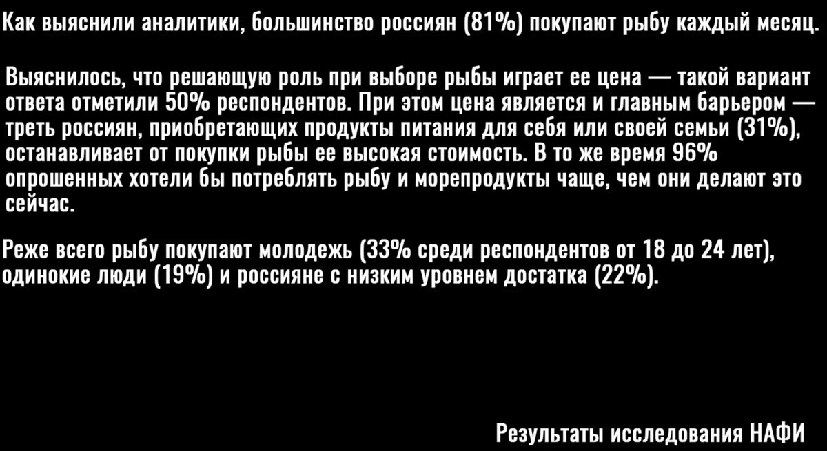 «Известия» с опорой на результаты ученых сообщают нам о том, что большинство россиян покупает рыбу каждый месяц, но главным критерием при покупке является её цена, а не гастрономические качества. При этом для многих россиян рыба из-за высокой цены является недоступным деликатесом. Самое интересное, что почти 100% опрошенных хотели бы потреблять морепродукты чаще, но не могут себе этого позволить.