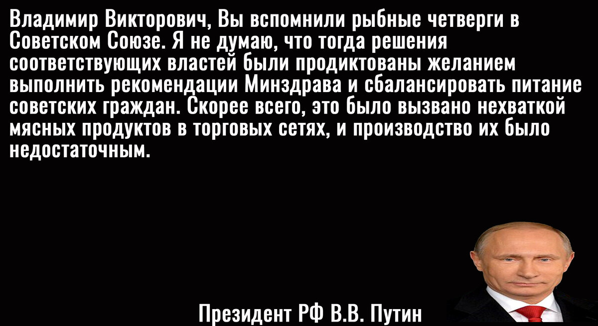 Поэтому совсем неудивительно, что когда на совещании с членами Правительства зашла речь о том, что наши сограждане едят мало рыбы, то разговор о причинах этого был мастерски переведен «главным начальником» на то, что в Советском Союзе всё было гораздо хуже, чем сегодня.