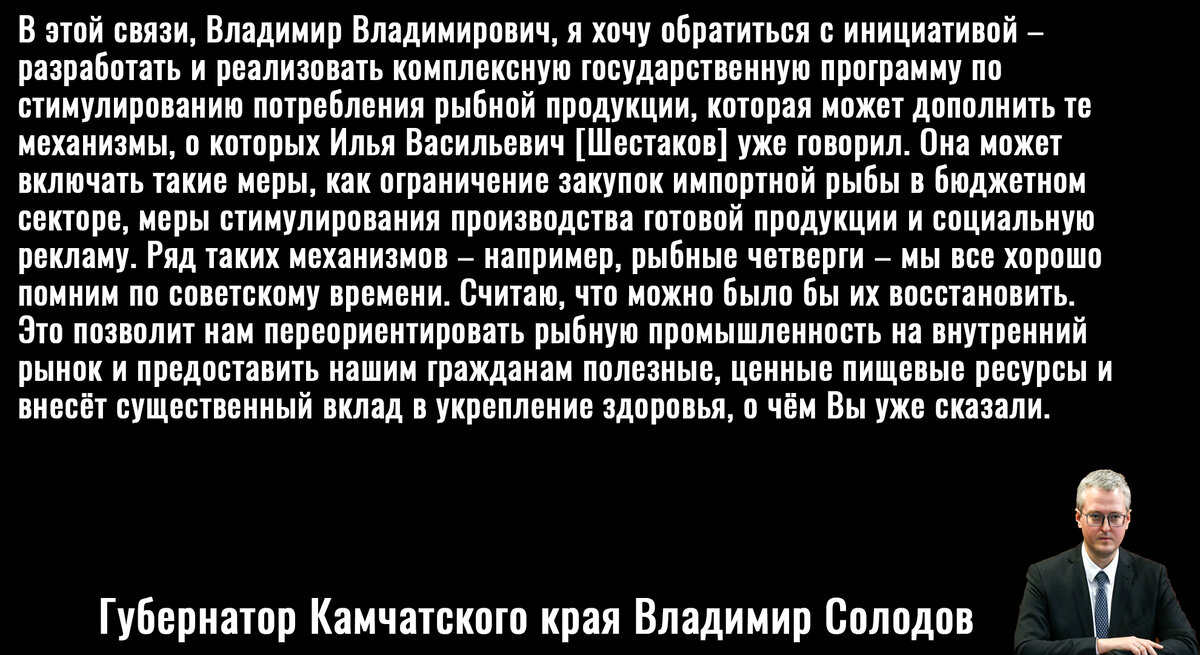 На эти негодования «главного начальника» губернатор Камчатского края Владимир Солодов предложил Путину подумать о восстановлении советской практики «рыбных четвергов». По словам чиновника, такой механизм позволил бы рыбной отрасли выйти на новый уровень, переориентироваться на внутренний рынок и решить проблемы с дефицитом потребления рыбы.