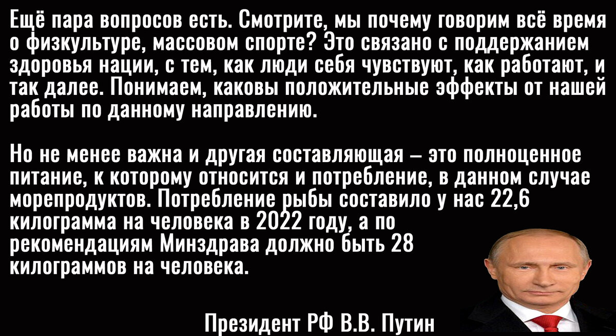 Началось всё с негодования Путина о том, что россияне едят значительно меньше рыбы, чем полагается в соответствии с рекомендациями Минздрава. Ведомство советует потреблять 28 килограмм в год на человека, а в России этот показатель составляет меньше 23 кг.