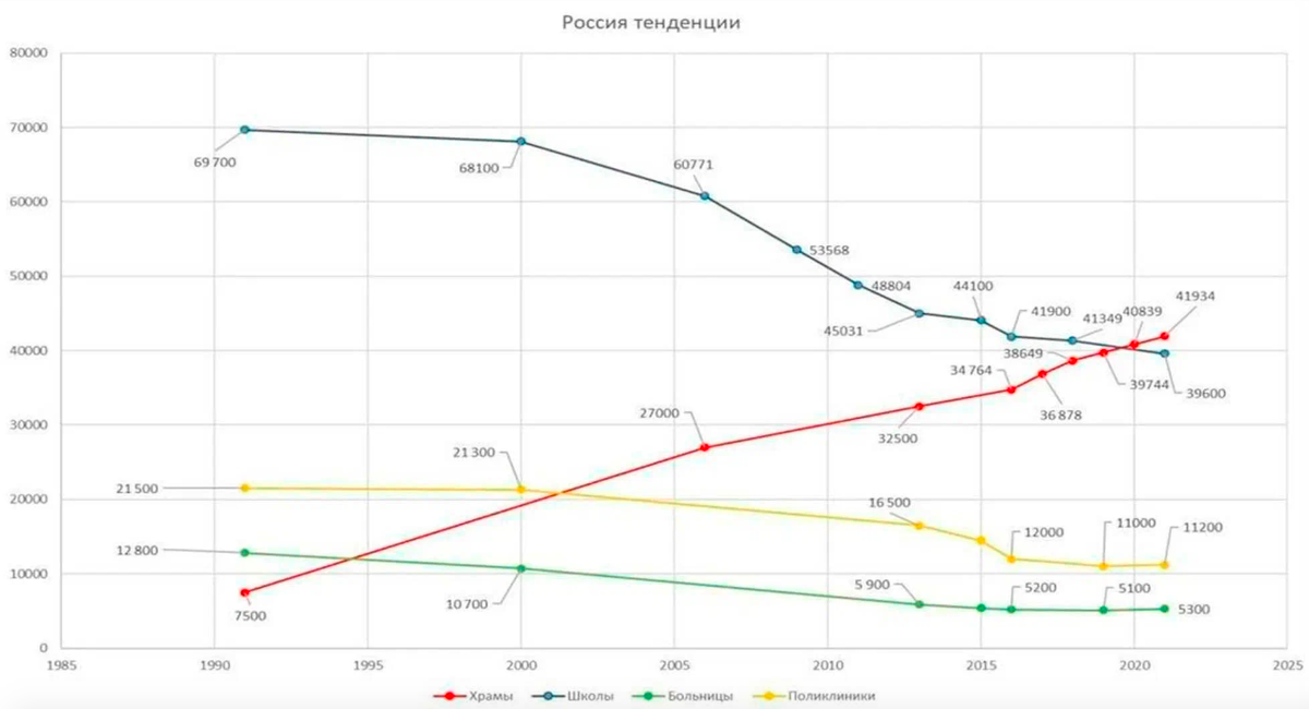 Причем важно понимать, что с Китаем или Индией работает «эффект масштаба», так как в каждой из этих стран живет больше 1,4 миллиарда человек. Поэтому даже при не самых больших расходах в этих странах будут миллионы инженеров, врачей и других специалистов. У России же такого козыря нет, поэтому важно работать на качество, стараясь дать качественное образование каждому человеку в нашей стране. Однако вместо этого происходит «оптимизация» образования и сокращение количества школ. За то растёт численность храмов…