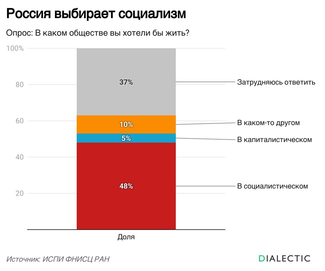 Несмотря на то, что правящий класс и их лакеи прикладывают огромное количество сил по очернению и демонизации социализма, а официальные "коммунисты" вроде КПРФ являются открытыми ренегатами, дискредитирующими идеи классиков марксизма, огромная часть россиян хотела бы жить именно в социалистическом обществе.