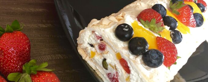 Рулет из безе с фруктами — это замечательный десерт. На его приготовление потребуется примерно час, а вкус просто великолепен. Вы можете готовить его летом, используя свежие ягоды и фрукты, или зимой с консервированными. Выглядит очень аппетитно!