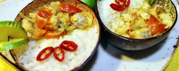- В блендер помещаем очищенный от семян перец чили (если хотите более острое, семена можно оставить), чеснок, растительное масло, соль, приправу карри и цедру лайма. Измельчаем до получения пасты карри. Обжариваем лук на подсолнечном масле. Затем добавляем пасту карри. Через минуту вводим нарезанные дольками помидоры. Заливаем кокосовым молоком, уменьшаем огонь. Увариваем соус до легкого загустения. В конце добавляем рыбу и доводим ее до готовности. Готовое карри обычно подают с отварным рисом. Рыбное карри готово. Приятного аппетита!