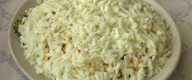 Яйца варить нужно в подсоленной воде в течении 15 минут на среднем огне. Затем положите их в холодную воду на 5 минут, чтобы скорлупа легко отделилась. Почистите их. Затем у вареных яиц отделяем белки от желтков. Трем желтки в мелкую терку, посыпаем ими салат и промазываем майонезом, то же самое проделываем и с белками. Салат готов к употреблению!