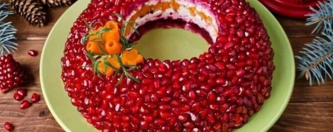 Попробуйте салат ‘Гранатовый браслет’ с курицей, овощами и зернами граната. Этот многослойный салат станет настоящим украшением вашего стола на праздничный ужин.
