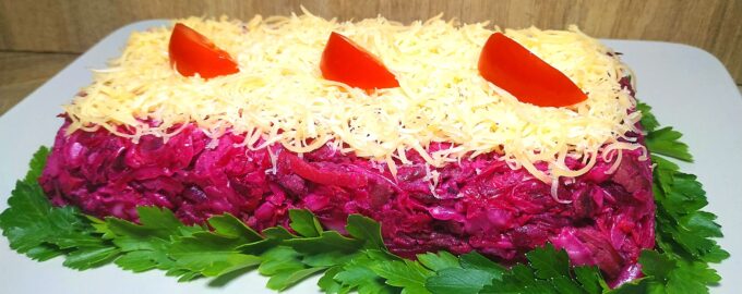 - На мелкой терке тру кусочек сыра непосредственно перед подачей на стол, чтобы сыр не заветрился. Украшаю листиками петрушки и помидорами черри. Можно украсить проще: петрушкой и калиной. Друзья, всех с наступающими праздниками и всего вам самого доброго!