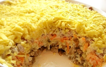 Внимание: каждый слой смазываем небольшим количеством майонеза с помощью столовой ложки. В салатницу первым делом выкладываем обжаренные шампиньоны. Затем добавляем 1/2 часть измельченных яиц. Третьим слоем укладываем рыбные консервы. Затем покрываем все овощной зажаркой. Предпоследним слоем добавляем оставшуюся часть яиц. В очередной раз смазываем все небольшим количеством майонеза и в завершение украшаем салат тертым твердым сыром. Вот и всё, блюдо готово!