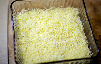 С помощью средней терки натираем твердый сыр прямо на разделочной доске. Пересыпаем стружку в свободную тарелку и оставляем в стороне.
