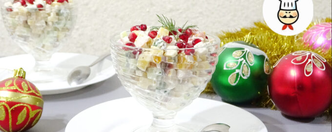 - Выкладываем салат в креманки и украшаем зернами граната. Добавляем веточку укропа. Вкусный и лёгкий новогодний салат «Зимняя романтика» готов. Как я готовлю этот салат, вы можете увидеть в коротком видео