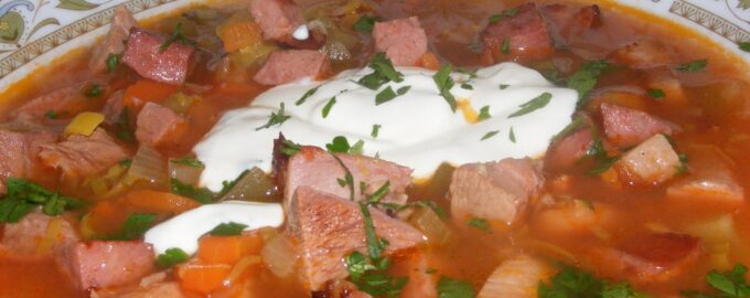 Верните в бульон нарезанное мясо, добавьте обжаренные овощи и колбасу с беконом. Включите нарезанный лук-порей и морковь. Влейте рассол. Досолите по вкусу и добавьте еще перца. Перемешайте и варите вместе 10-15 минут. Если хотите, чтобы бульон получился погуще, добавьте немного муки. Если бульон слишком кислый, добавьте 1-2 ч.л. сахара. Посыпьте нарезанной зеленью и оставьте под крышкой на 10 минут.