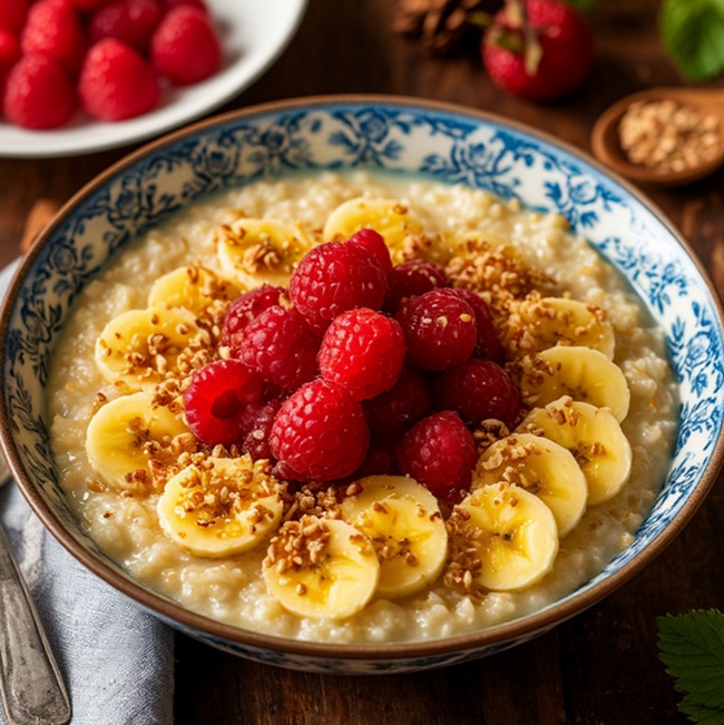 Затем блюдо отправляется в духовку, где оно запекается до золотистой корочки. Перед подачей каша украшается оставшимися ягодами, карамелизированными орехами, посыпается сахарной пудрой, сбрызгивается медом и подается как в горячем, так и в охлаждённом виде.