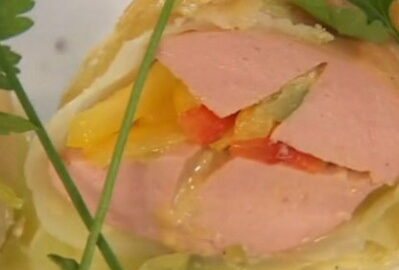 Внутри каждой сардельки намазать горчицей, положить несколько кусочков соломки болгарского перца, осторожно сложить и завернуть в капустный лист. Повторить процесс с остальными сардельками. - Следующий шаг заключается в том, что мы должны нарезать слоёное тесто на полоски шириной в сардельку и обернуть их тестом. Куриное яйцо взбить венчиком и смазать поверхность теста. Если хотите, то можно приготовить очень вкусное домашнее слоёное тесто самостоятельно, рецепт его приготовления смотрите здесь.