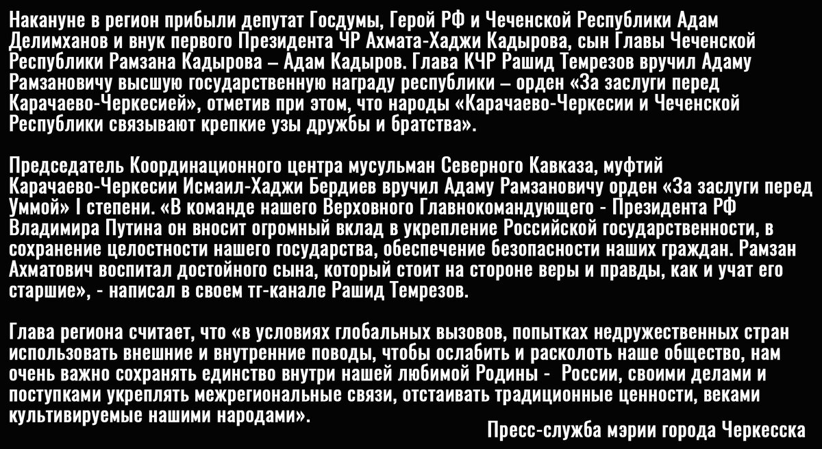 Однако за какие заслуги орденами награждается пятнадцатилетний подросток не могут четко сформулировать даже сами региональные власти. Например, на официальной сайте столицы Карачаево-Черкесской Республики в комментарии пресс-службы нет какой-то четкой формулировки за какой подвиг или достижение вручается самая главная награда этой республики.
