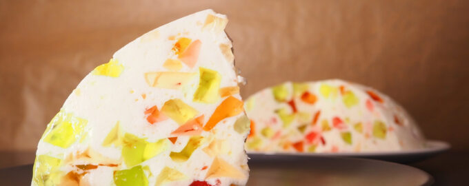 Взбить еще немного. - Нарезать цветное желе кубиками и добавить в большую форму к сметанному желе.