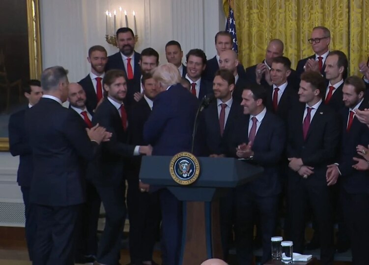 «Для меня большая честь принимать эту замечательную команду в Белом доме. Это огромная радость выразить этой команде несколько комплиментов. Они проделали незабываемую работу. Я наблюдал за несколькими матчами — эти ребята играли мощно. Вы снова оставили Канаду без Кубка Стэнли и продлили их неудачную серию. Если говорить о вашей чемпионской защите, то легендарный Сергей Бобровский, известный всем как «Боб», в плей-офф был просто выдающимся. С его стороны это было серьезное заявление на вторую победу в Кубке. Он сделал три «сухаря» в каждой из первых трех серий, включая решающий четвертый матч в противостоянии с «Торонто» во втором раунде. Он играл феноменально, просто феноменально!» — сказал Трамп.