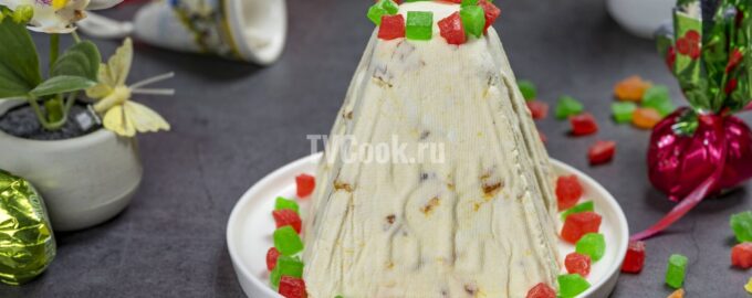 Достаем пасху из холодильника по истечении времени и, поставив ее на тарелку, освобождаем от формы, после чего украшаем готовую праздничную пасху по вкусу цукатами.