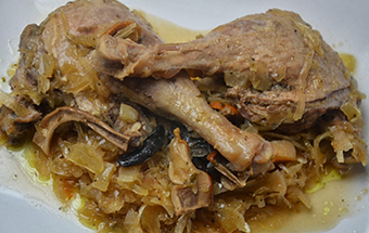 Теперь добавляем сюда нарезанный лук, морковь и чеснок. Снова включаем режим «Жарка» и готовим блюдо на протяжении 10 минут, периодически помешивая содержимое кастрюли кухонной лопаткой. По истечении времени добавляем сюда изюм и чернослив, а также отжатую квашеную капусту. Обязательно всё по вкусу солим и перчим, затем вливаем горячий бульон или воду. Устанавливаем режим «Тушение» на 45 минут и плотно закрываем крышку мультиварки. Когда прозвучит сигнал, не спешим звать всех к обеденному столу. Теперь устанавливаем режим «Выпечка» и продолжаем готовить утку с капустой ещё 1 час. Важно: время от времени открываем крышку электроприбора, проверяем блюдо, обязательно его перемешиваем и при необходимости добавляем немного бульона или воды. За 10 минут до завершения добавляем в кастрюлю пару лавровых листьев и ждем, когда прозвучит сигнал. После этого не торопимся открывать мультиварку, а даем блюду постоять еще примерно 20 минут. -