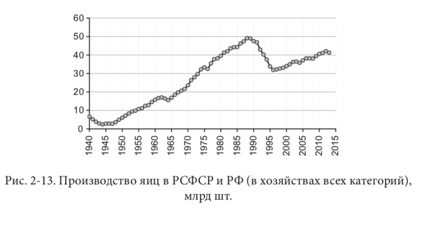 К слову, если обратиться к данным экономической статистики, то можно узнать, что в советское время никаких проблем с производством яиц не было. Сельское хозяйство РСФСР прекрасно обходилось без немецких инкубационных яиц и европейских кормов с прививками. При капитализме же советские показатели догнать так и не сумели.