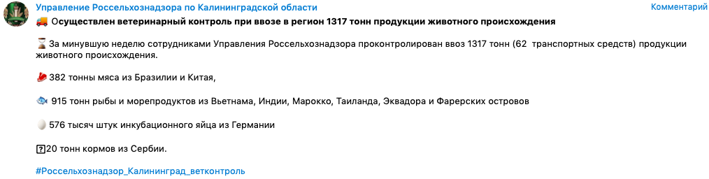 Обратите внимание, что кроме яиц только за одну неделю и только через Калининградскую область в Россию ввезли огромное количество мяса и рыбы. В связи с этим хотелось бы узнать, например, у "главного начальника", где то самое высокоэффективное сельское хозяйство, которое на голову выше советского? Ведь, именно об этом нам с вами неоднократно рассказывали.