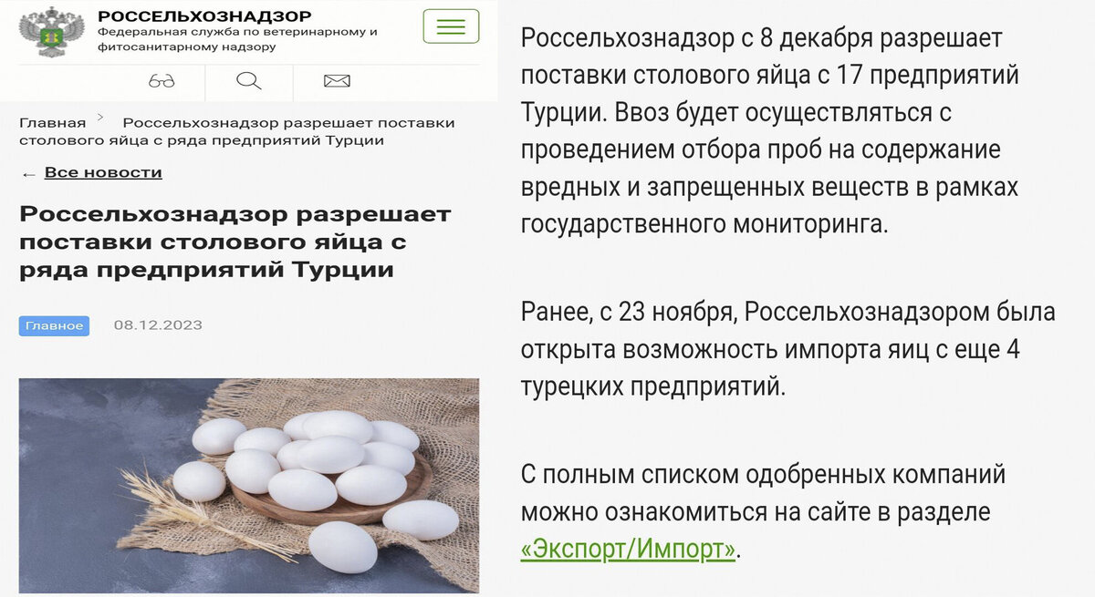 Однако сегодня крайне странно наблюдать, что эта сверхдержава решает "яичный кризис" за счет поставок из Турции, Ирана и Азербайджана. На этот счет была отдельная статья на данном канале. Ещё более странно, что яйца в Россию стали завозить не только из "дружественных стран", но и из Европы.