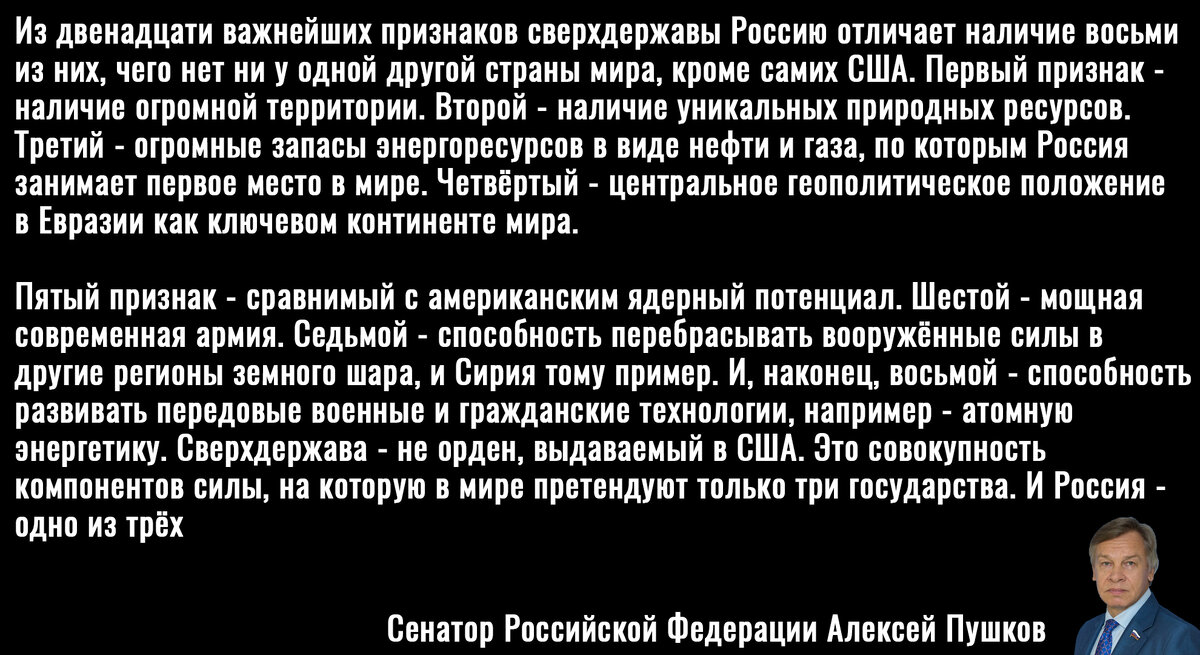 Не смотря на целый комплекс глубинных, фундаментальных проблем, которые проистекают из самих основ сложившейся экономической системы, россиян из года в год заверяют, что всё хорошо. Например, в 2021 году сенатор Пушков бравировал тем, что современная Россия – это могучая сверхдержава.