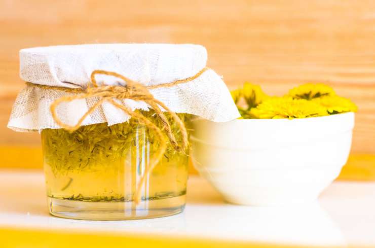 Положите очищенные от кожуры и сердцевины яблоки в кастрюлю с горячей водой и ¾ цветков одуванчика (с зеленью), варите 10 минут, яблоки должны стать мягкими, а жидкость — ярко-оранжевой. Процедите смесь через сито.