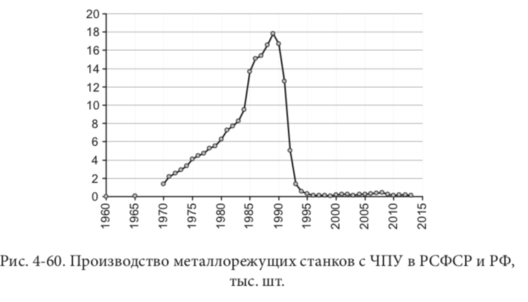 И параллельно со всем этим уничтожалась огромная советская промышленность. "Успешные люди", которых сейчас можно найти на страницах журнала Forbes и других бизнес-изданий скупали за копейки целые заводы, которые позже распиливались на металлолом. К 1995 году производство станков с ЧПУ упало фактически до нуля.