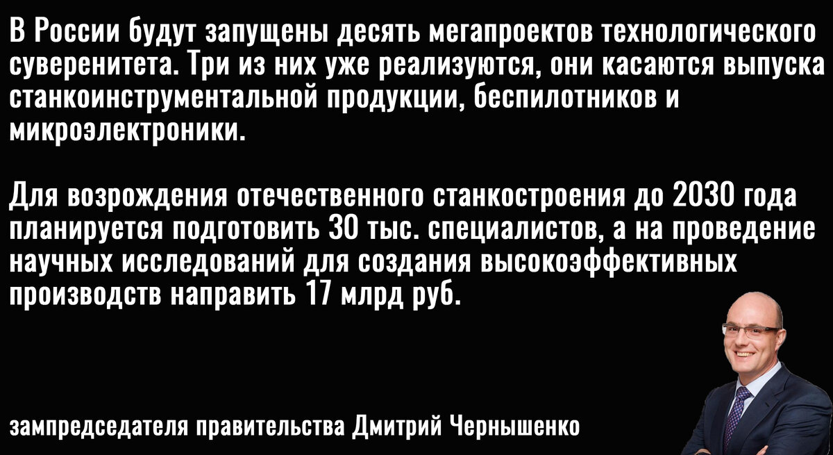 Например, в этот раз "эффективные менеджеры" в лице зампредседателя правительства Дмитрий Чернышенко обнаружили, что в России необходимо возрождать собственное станкостроение для чего необходимо подготовить десятки тысяч квалифицированных специалистов и потратить миллиарды рублей из бюджета.