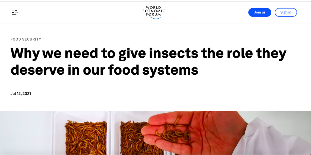 Например, никто иной как глава Всемирного экономического форума (ВЭФ) Клаус Швабб и его коллеги на протяжении многих лет очень настойчиво под видом заботы об окружающей среде и голодающих народах, продвигают популяризацию еды из сверчков, мух и личинок. На сайте ВЭФ есть даже статья с громким заголовком о том, что человечество недооценивает важность насекомых в своем рационе.
