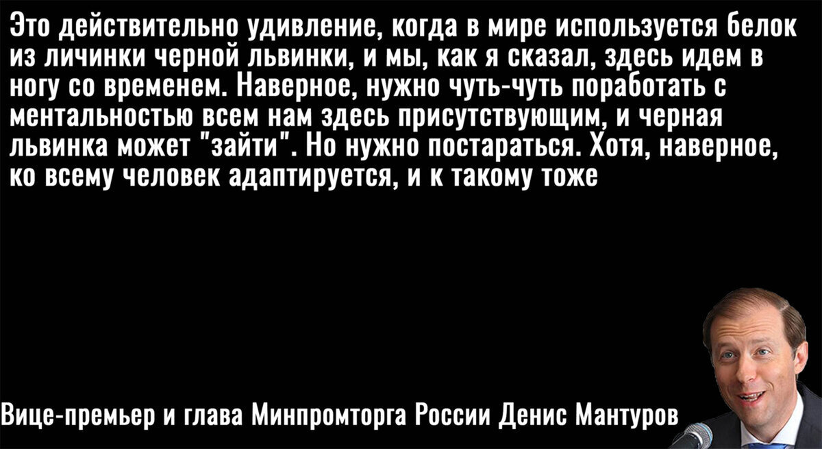 Отечественные "квасные патриоты" некоторое время ехидно посмеивалась над западными обывателями, которым денно и нощно стали рассказывать о пользе сверчков и личинок. Однако поводов для смеха тут совсем нет, так как в России происходят все те же самые процессы, но с небольшим запозданием. И вот никто иной как Министр промышленности и торговли Мантуров в прошлом году рассказал о том, что питаться личинками мух – это очень прогрессивно.