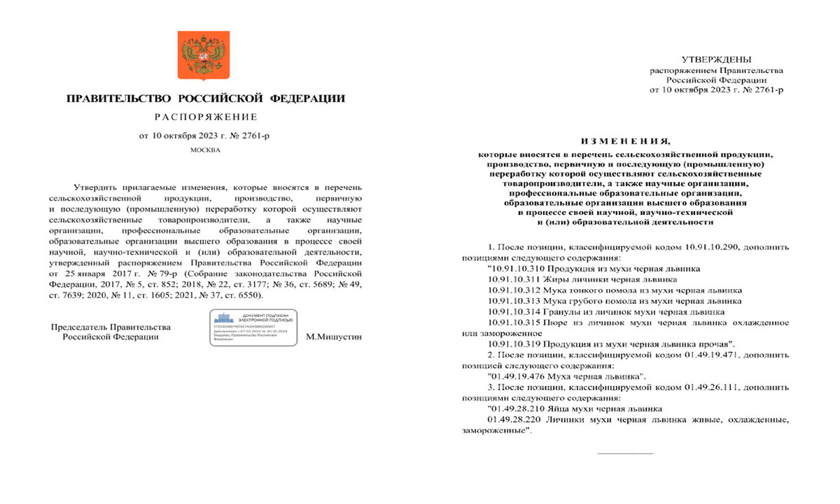 На протяжении нескольких последних лет стали появляться различные публикации о превосходстве такого типа питания над традиционным, а в середине октября этого года Правительство выпустило указ, который не стали широко афишировать публике. Из распоряжения за номером 2761-р следует, что мухи и личинки теперь относятся к сельскохозяйственной продукции.