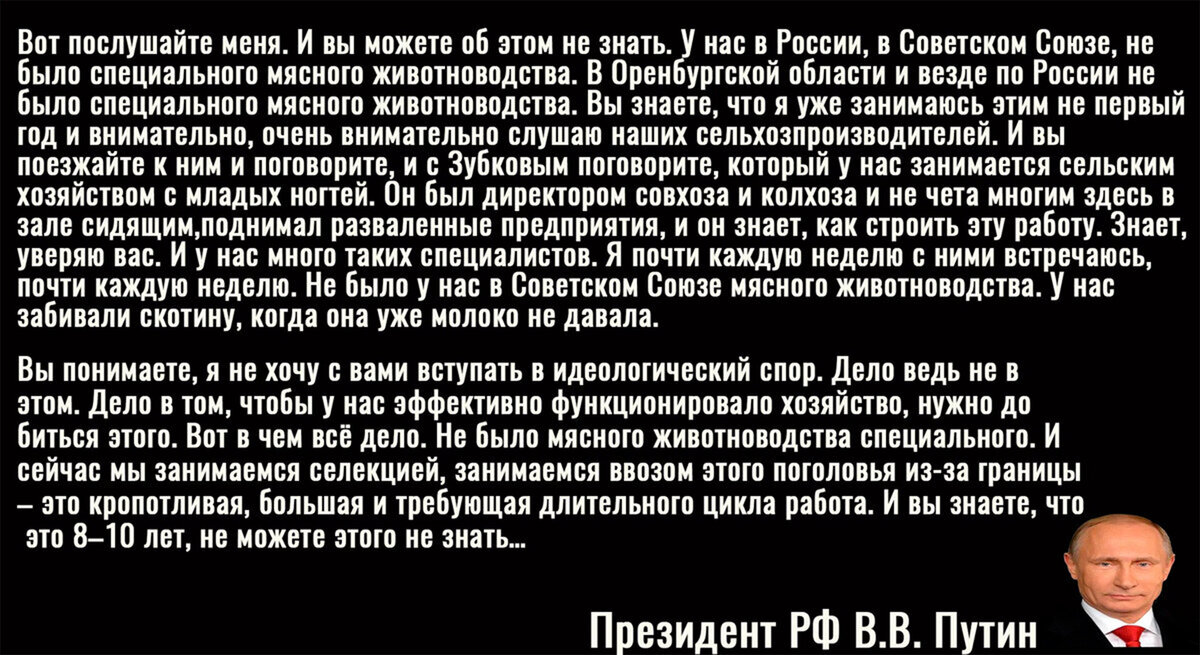Правда, достаточно выйти в интернет, чтобы найти огромное количество фотографий советских свинокомплексов, огромных колхозов и совхозов с большим поголовьем скота и других аграрных предприятий. Но раз "главный начальник" сказал, что не было в Советском Союзе мясного животноводства, значит не было.