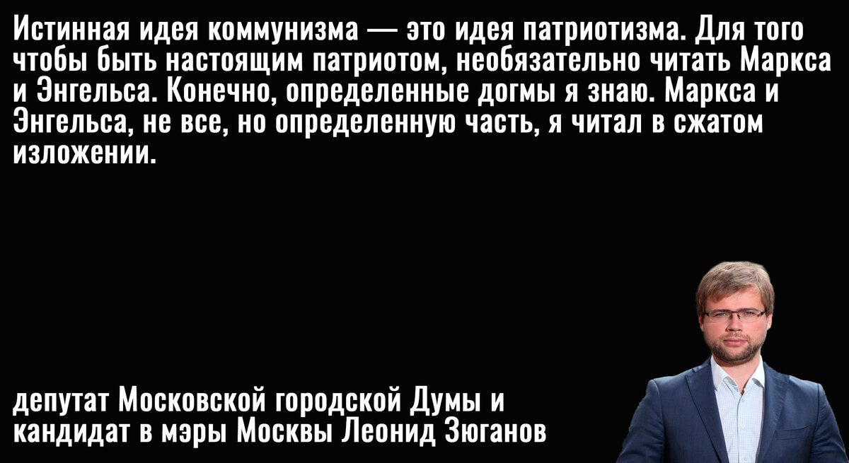 Ещё в 2014 году молодой «коммунист» Зюганов заявил, что учение Маркса и Энгельса – это догмы, а их работы он читал лишь в сжатом изложении. И, вообще, главная идея коммунизма – это патриотизм, а для того, чтобы быть патриотом, читать классиков марксизма вовсе не обязательно.