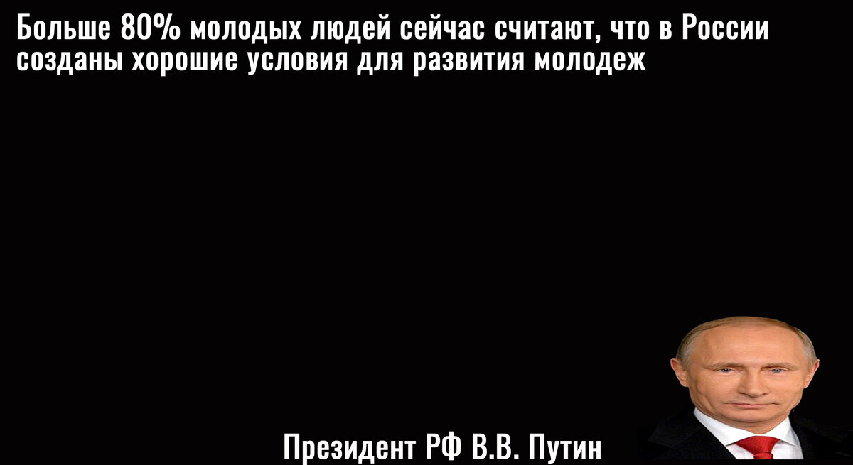 В это же самое время действующий президент Путин рассказывает, что для молодежи в нашей стране созданы просто отличные условия, и более 80% молодых людей солидарны в этом с «главным начальником». Как видим, между данными президента и результатами исследования РАО есть очевидное противоречие.