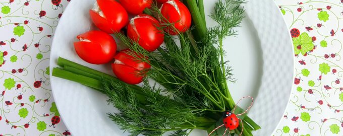 Вставьте аккуратно перья зеленого лука в отверстия внизу помидоров и красиво уложите получившиеся «тюльпаны» на тарелку.